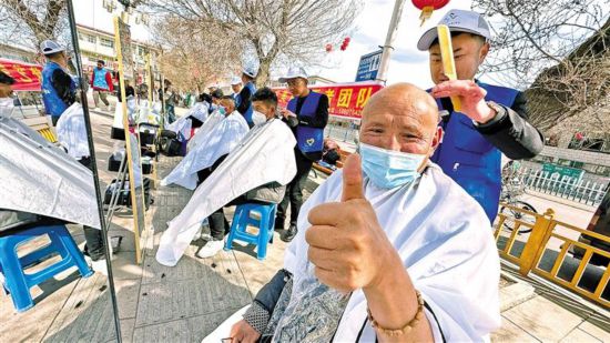在拉薩市開展的“ 民族團結一家 巧手剪出民族情”愛心義剪志愿服務活動中,理發(fā)師們?yōu)楦髯迦罕娎戆l(fā)。記者 格桑倫珠 唐斌 攝