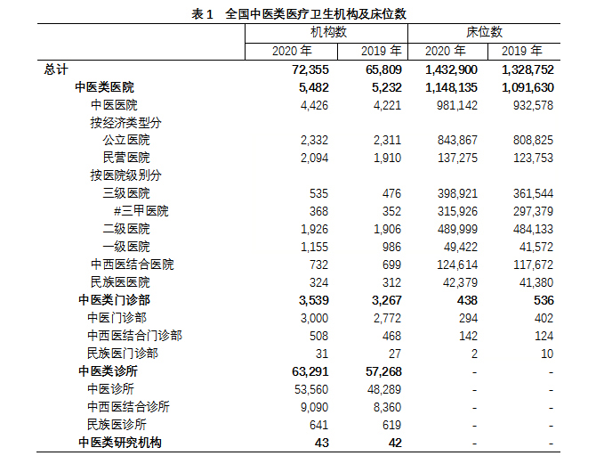 《報(bào)告》指出,2020年醫(yī)療衛(wèi)生機(jī)構(gòu)中中醫(yī)類醫(yī)療衛(wèi)生機(jī)構(gòu)(包括中醫(yī)類醫(yī)院、中醫(yī)類門診部、中醫(yī)類診所、及隸屬于衛(wèi)生部門的中醫(yī)類研究機(jī)構(gòu))達(dá)到72355個(gè),與2019年的65809個(gè)相比,增加了6546個(gè),增幅為9.9%。占全國(guó)醫(yī)療衛(wèi)生機(jī)構(gòu)總數(shù)的7.1%,高于2019年的6.5%。