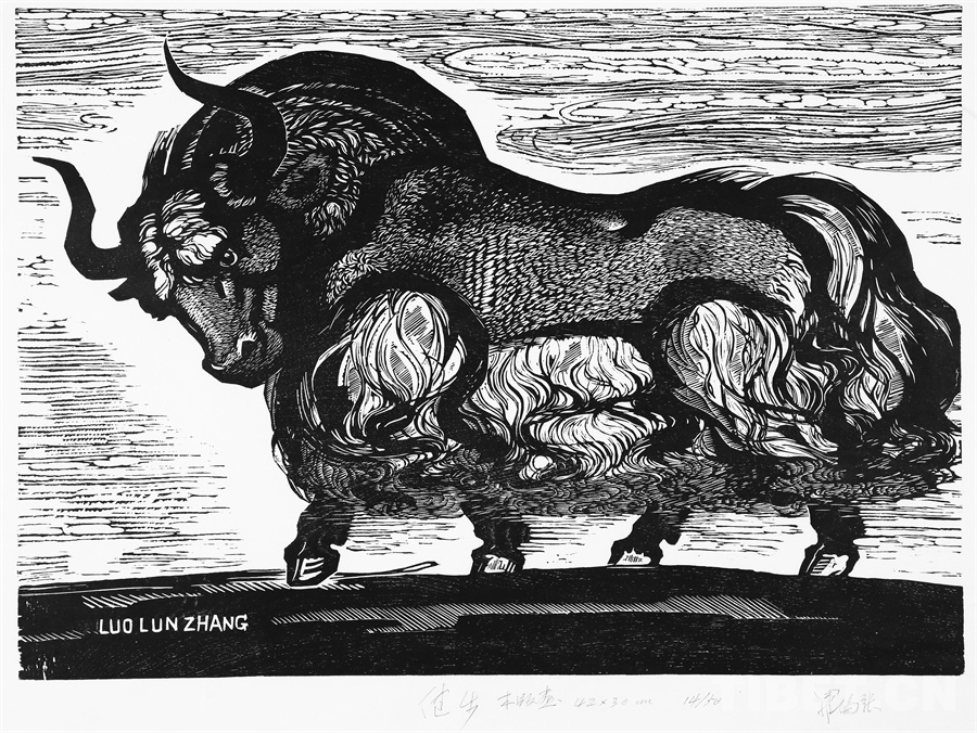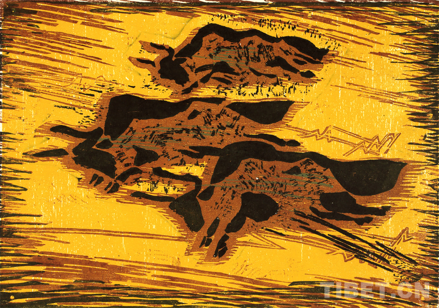 如果非要說我在版畫技法上有什么創(chuàng)新,參照西藏匠人刻經(jīng)文,在石頭上刻出來然后印出來也許就算。這不是一般石版畫概念,那叫石印,平版印刷;我這是凹版印刷??唐饋砗苜M勁,我也不管費不費勁。我有一批這樣的石刻作品。綜合版作品手法較多,我通常分別在石板和木板上刻,然后套起來印。如果搞學(xué)術(shù)交流,也許值得一談。至于說到創(chuàng)新,第一我不認(rèn)為我有什么創(chuàng)新,第二我不認(rèn)為在藝術(shù)上、在美術(shù)上能夠輕易談創(chuàng)新這個詞。還有第三個觀點:不需要創(chuàng)新。很簡單,你先把傳統(tǒng)學(xué)到手再說。既是傳統(tǒng),就有它的存在理由,否則早就夭折了,還傳什么統(tǒng)呢?傳,而且統(tǒng)??!統(tǒng)是什么意思?基調(diào)是它統(tǒng)一起來的。先把傳統(tǒng)學(xué)到手,爐火純青了,神來之筆出現(xiàn)了,才有可能有所創(chuàng)造?;A(chǔ)是重要的。