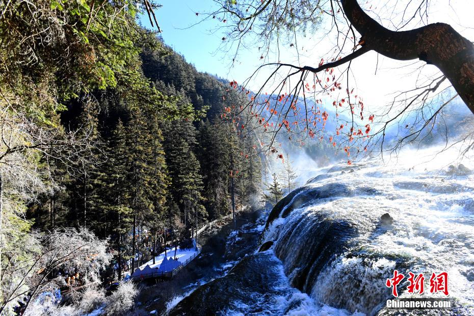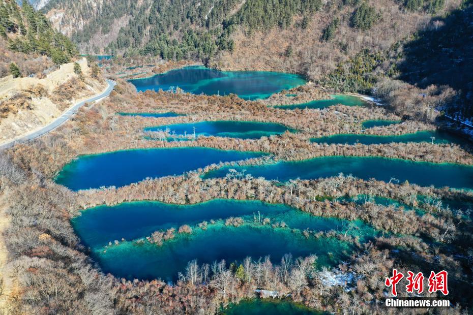 1月5日,冬日的九寨溝一片銀裝素裹的景象,顯得格外的寂靜,仿佛人間仙境。圖為航拍火花海風(fēng)光。安源 攝