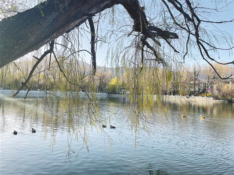 春風(fēng)不僅化開(kāi)了宗角祿康的湖水,也化開(kāi)了這座高原古城一整個(gè)寒冬的倦懶。柳樹吐露出稚嫩的樹芽,成群的赤麻鴨、斑頭雁浮游在湖中,享受著“紅掌撥清波”的悠閑……