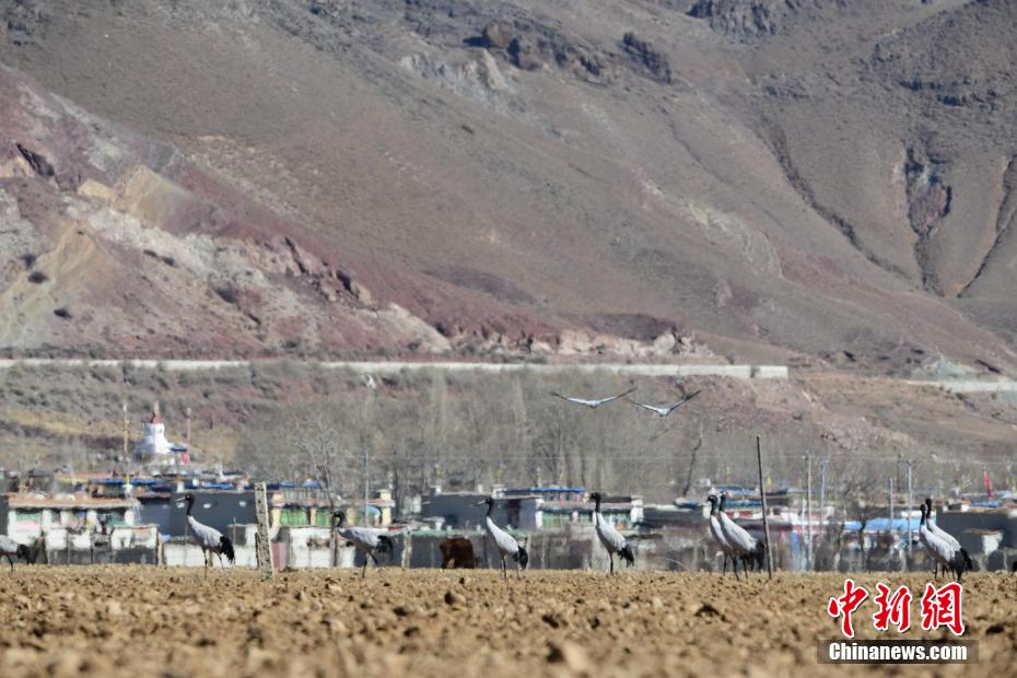 每年的10月底,成群的黑頸鶴飛到西藏拉薩市林周縣越冬,在拉薩市林周縣周邊的湖泊濕地度過(guò)5個(gè)月的“閑云野鶴”生活,次年三四月份再飛向藏北草原繁殖。黑頸鶴是世界上唯一一種高原鶴類(lèi)。具有足長(zhǎng)、喙長(zhǎng)、頸長(zhǎng)的典型涉禽類(lèi)特征,適合在沼澤地里行走。黑頸鶴的頸、尾為黑色,體羽為灰白色。黑頸鶴是國(guó)家一級(jí)保護(hù)動(dòng)物。目前,每年到林周縣越冬的黑頸鶴已達(dá)2000只左右。圖為黑頸鶴在林周境內(nèi)的農(nóng)田里覓食。 貢嘎來(lái)松 攝