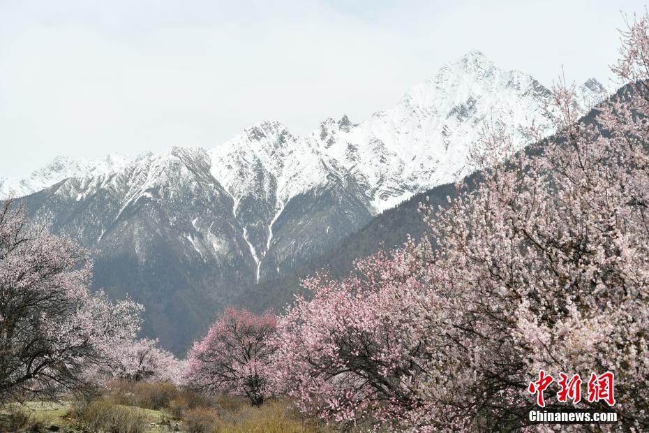 圖為桃花盛放,遠(yuǎn)處雪山映照。貢嘎來松 攝