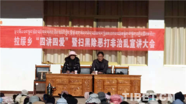 中國(guó)西藏網(wǎng)訊 為深入開(kāi)展掃黑除惡打非治亂專項(xiàng)斗爭(zhēng)宣傳工作,堅(jiān)決打贏掃黑除惡專項(xiàng)斗爭(zhēng)攻堅(jiān)戰(zhàn),防范化解社會(huì)風(fēng)險(xiǎn),西藏自治區(qū)山南市加查縣拉綏鄉(xiāng)分別于11月4日、14日、15日、16日在蘇夏村、藏木點(diǎn)(覆蓋滾追巴村、崗巴村、瑪羅村、巧巴村)、鄉(xiāng)政府大院(覆蓋葉云村、拉綏村、昂達(dá)村)、拉索村四地開(kāi)展了“四講四愛(ài)”暨掃黑除惡打非治亂宣講大會(huì),參與群眾1260余人,全鄉(xiāng)9個(gè)行政村全覆蓋,全面加強(qiáng)干部群眾掃黑除惡的法治觀念和法律意識(shí)。(中國(guó)西藏網(wǎng) 通訊員/廖昆)。