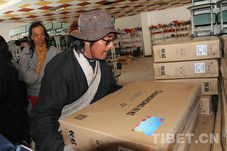 現(xiàn)場,6戶貧困戶代表上臺領(lǐng)取了電視機(jī)。嶄新的長虹液晶電視捧在手上,農(nóng)牧民群眾個個滿臉掛著燦爛的笑容。“現(xiàn)在路也好了、電也通了,又給我們發(fā)電視機(jī),我們從心底感謝黨中央?。 卞`l(xiāng)受贈群眾代表多吉用藏語感激地說。