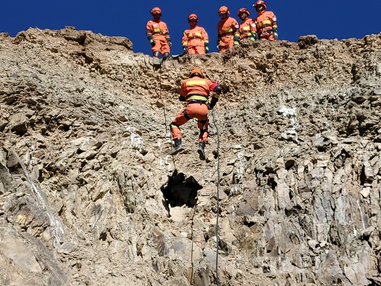 圖為復(fù)雜地形下降訓(xùn)練,進(jìn)一步提高隊(duì)員應(yīng)對(duì)各種環(huán)境中繩索救援技術(shù)的綜合運(yùn)用能力