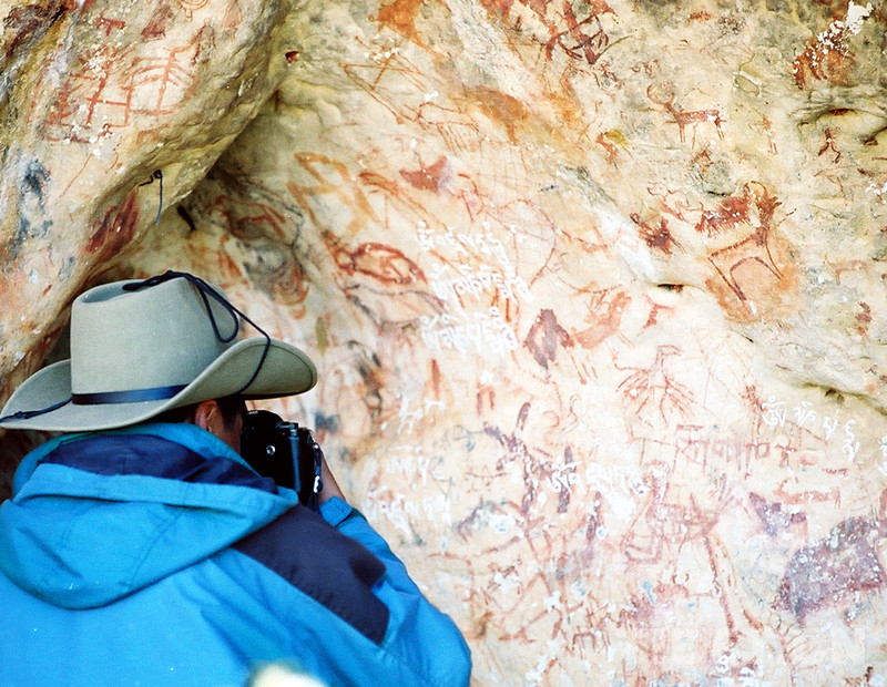 這是藏北高原無(wú)人區(qū)科考人員在考察溶洞巖畫(唐召明2001年攝)