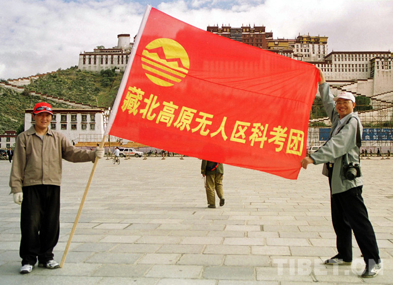 這是唐召明在隨藏北高原無(wú)人區(qū)科考團(tuán)出征時(shí),展隊(duì)旗拍照留念(唐召明提供,2001年攝)