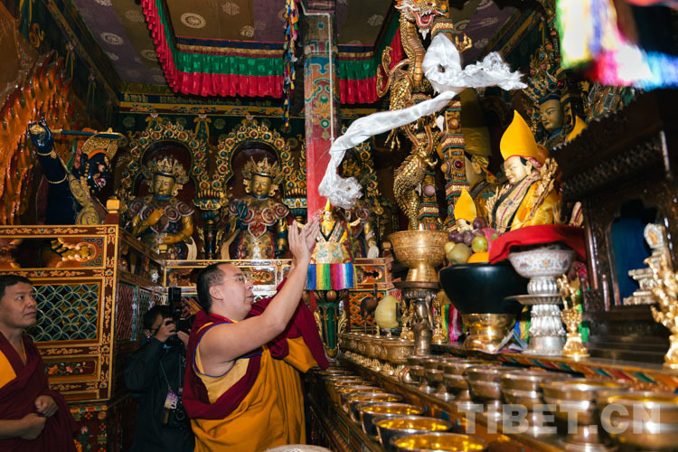 9月24日,十一世班禪來(lái)到乃堆拉群山中的噶舉寺,在寺院僧人引領(lǐng)下,緩步走入寺院大殿禮佛,為大殿開(kāi)光加持。隨后十一世班禪前往主殿二樓依次朝拜了甘珠爾殿、噶舉頗章殿、度母殿、強(qiáng)康殿和護(hù)法殿。