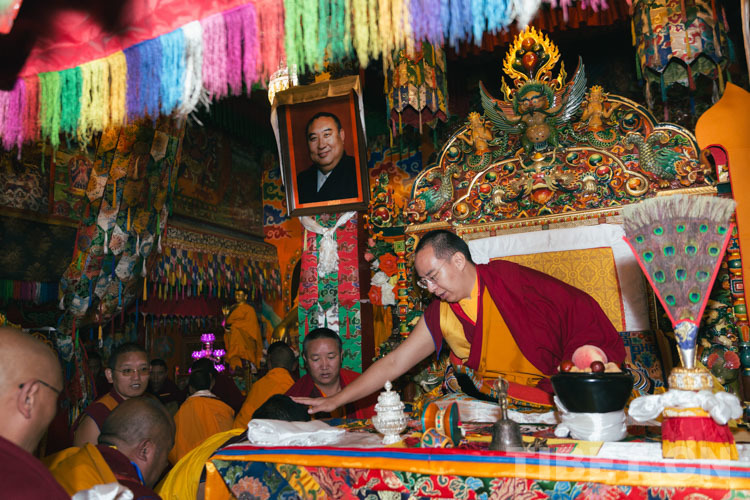 圖為十一世班禪在吉汝寺展佛臺(tái)前為展佛唐卡開(kāi)光 攝影:鄭朔