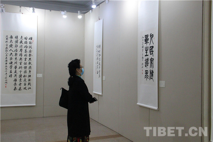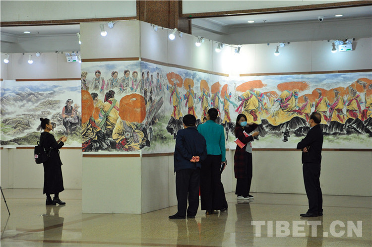 本次展覽由西藏自治區(qū)文學(xué)藝術(shù)界聯(lián)合會、西藏高山文化發(fā)展基金會主辦,西藏自治區(qū)人民政府駐北京辦事處和《一帶一路與茶馬古道》籌委會協(xié)辦,由張飆、鄭山麓、黃家林三位藝術(shù)家聯(lián)袂,以書法、詩詞、繪畫的藝術(shù)形式展現(xiàn)了在黨中央堅(jiān)強(qiáng)領(lǐng)導(dǎo)下,西藏自治區(qū)取得的巨大成就,以及西藏自治區(qū)各族人民加強(qiáng)民族團(tuán)結(jié)、建設(shè)美麗西藏的生動實(shí)踐。同時(shí),本次展覽展品中還包括了記錄醫(yī)護(hù)工作者抗擊新冠肺炎疫情的優(yōu)秀作品。在上百件展品中,張飆創(chuàng)作的反映西藏自治區(qū)經(jīng)濟(jì)社會發(fā)展成就的詩詞、書法,鄭山麓創(chuàng)作的呈現(xiàn)西藏自治區(qū)舞蹈藝術(shù)魅力的60米國畫長卷《甲諧舞吉祥之盛世歡歌》,以及黃家林以布達(dá)拉宮為主題創(chuàng)作的油畫作品是展覽的亮點(diǎn),吸引觀眾紛紛駐足。