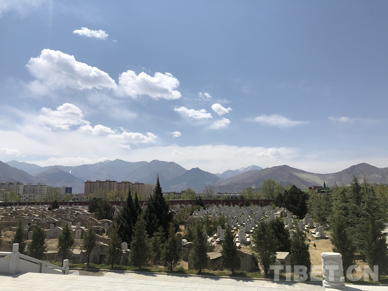 一到陵園,大門口一幅“為有犧牲多壯志、敢教日月?lián)Q新天”的對聯(lián),也讓我們此次祭奠活動突然有了一種特別的精神支撐,我感覺這句話放在西藏這個地方最合適,但暫時說不出為什么。我們登記以后,緩步走進陵園。整個陵園正前方一大片寬闊的廣場,題有“革命烈士永垂不朽”漢藏兩種文字的紀念碑,默默地矗立在廣場中央,碑的左右兩邊各立著一面一人高的國旗和黨旗。花崗石顏色的巨大紀念碑和肅穆的廣場,映襯著鮮艷的國旗和黨旗,背后是圍繞著墨綠松柏和剛剛發(fā)芽唐柳的烈士墓地,更遠處是拉薩河谷的壯闊群山和高原湛藍的天空,風從這之間吹過,似乎在訴說著這片土地上發(fā)生的故事和長眠此處烈士們經(jīng)歷過的波瀾壯闊。我們?nèi)〕龌ㄊ凸_,獻至紀念碑,并肅穆感懷革命烈士的英勇壯烈和無私奉獻,最后用三鞠躬表達我們對先烈的緬懷和致敬。