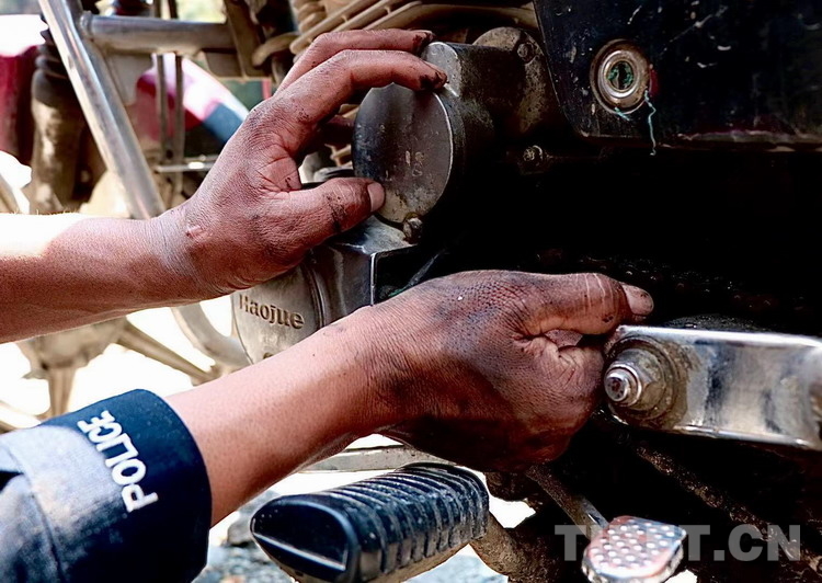 如果你經(jīng)過日喀則邊境管理支隊陳塘邊境派出所頓樟執(zhí)勤點,你有可能會在執(zhí)勤點旁邊的空地上看見一位不停揮舞著扳手,雙手沾滿機油的民警正圍著摩托車忙碌著。他叫王昱隆,是陳塘邊境派出所的一名民警,年初被分配到頓樟執(zhí)勤點,到現(xiàn)在他已經(jīng)義務(wù)幫助不少地過往行人維修摩托車了。