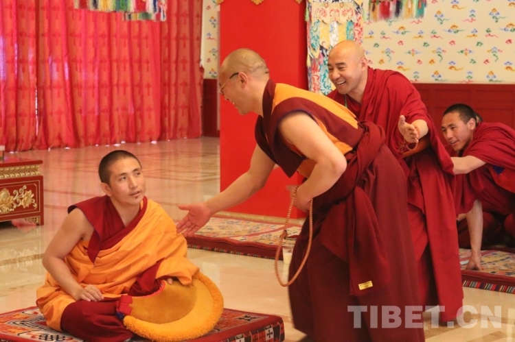 進入考場后,學僧和辯經(jīng)人員分兩排盤腿相對而坐,評委就坐于考場正上方。集體誦經(jīng)后,評委根據(jù)名單,依次讓學僧和辯經(jīng)人員出列進行辯經(jīng)。這時參加考評的學僧盤腿就坐于考場正中央,伴著兩掌相擊發(fā)出清脆的聲音,辯經(jīng)人員圍繞著學僧,不斷提出問題,言辭激烈,答辯者則不僅要口若懸河,更需要沉著應(yīng)對。