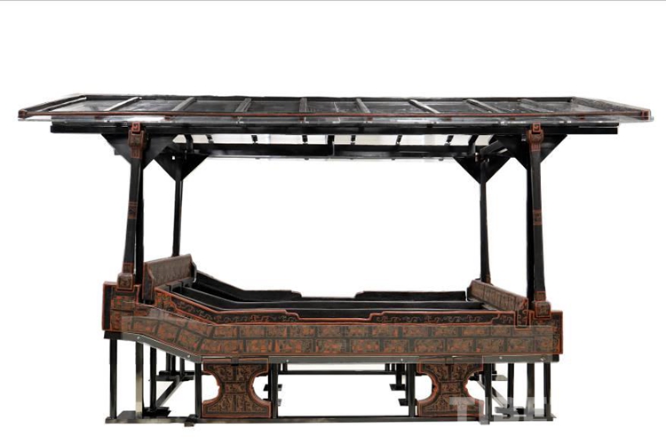 2000年,在成都商業(yè)街船棺墓葬群出土了迄今為止體量最大的船棺以及數(shù)百件精美的漆器,為古蜀文明研究提供了極其重要的實物資料。其中這件斷代約為春秋晚期到戰(zhàn)國早期、據(jù)專家推測可能來自古蜀王國的“豪華”漆床令人嘆為觀止。漆床長2.55米、高約1.8米、寬1.3米,由45個構(gòu)件組合而成,構(gòu)件中最長的床頂正脊長達3.27米,最小的只有26.5厘米,床頂應該還搭有織物床幔。是中國目前年代最早、體量最大、結(jié)構(gòu)最為復雜、保存最完整的漆床。漆床四側(cè)床板通體黑漆,板上朱、赭二色繪制的回首狀龍紋,朱色單線勾勒的蟠螭紋華貴精美,彰顯著墓主人的尊貴身份。出土時,漆床部分構(gòu)件被盜擾,飽水糟朽,結(jié)構(gòu)脆弱。經(jīng)過清洗消毒、加固脫水、干燥定形等技術處理,它極致奢華的風采得以面世。