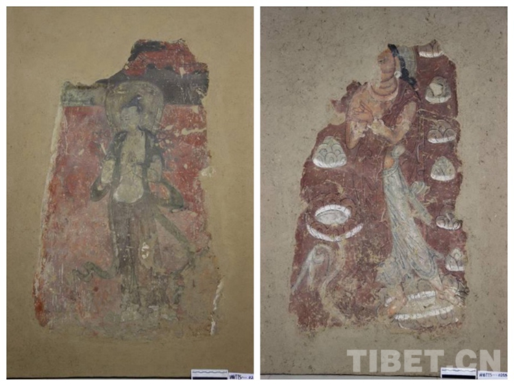 圖為修復后的表層壁畫(左)和修復后的底層壁畫(右)。原藏于甘肅武威天梯山石窟第 4 窟中心柱,現(xiàn)為武威市天梯山石窟保護研究所藏