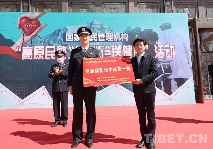 圖為“高原民警義務(wù)巡診送健康”活動(dòng)啟動(dòng)儀式上,國家中醫(yī)藥管理局為西藏出入境邊防檢查總站贈(zèng)送一批高原病防治中成藥。 攝影:何宇恒