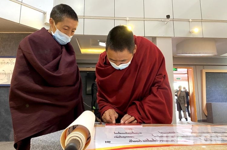 圖為2021年5月,“同心共筑中國夢(mèng)”——西藏僧尼群眾書法精品展現(xiàn)場(chǎng),僧尼正在觀看展現(xiàn)了烏金體、朱匝體等20余種風(fēng)格迥異的藏文書法體系的書法作品《藏文字體大全》 攝影:王媛媛
