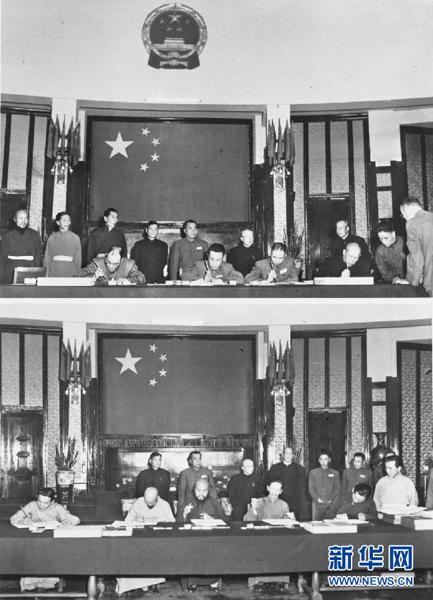 圖為1951年5月23日,中華人民共和國中央人民政府全權(quán)代表(上圖)和西藏地方政府全權(quán)代表(下圖)在《中央人民政府和西藏地方政府關(guān)于和平解放西藏辦法的協(xié)議》上簽字。上圖坐者右起為中央政府全權(quán)代表:李維漢、張經(jīng)武、張國華、孫志遠(yuǎn)。下圖坐者右起為西藏地方政府全權(quán)代表:阿沛?阿旺晉美、凱墨?索安旺堆、土丹旦達(dá)、土登列門、桑頗?登增頓珠。