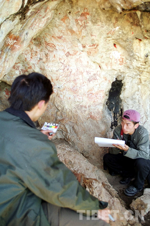 這是藏北無人區(qū)科考團科考人員在對班戈縣洞窟巖畫進行科學(xué)考察(唐召明2001年攝)