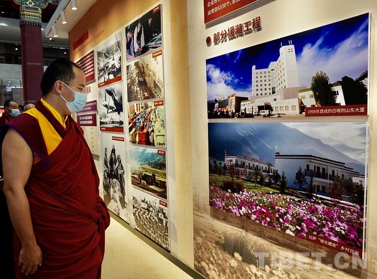《十七條協(xié)議》簽訂、西藏自治區(qū)第一次人民代表大會召開、習(xí)近平總書記來信、對口援藏資金圖表……一幅幅圖片、一份份史料將西藏和平解放70年來,西藏從黑暗走向光明、從落后走向進步、從貧窮走向富裕、從專制走向民主、從封閉走向開放的歷史生動地呈現(xiàn)出來。班禪不時駐足觀看,詳細(xì)詢問有關(guān)情況,對西藏近年來各項事業(yè)取得的成就予以充分肯定。