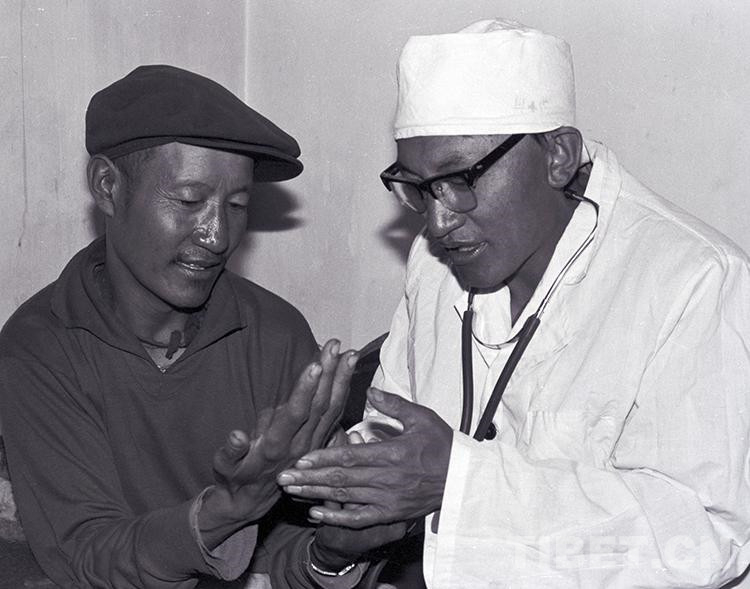 這是文部辦事處(現(xiàn)尼瑪縣)衛(wèi)生院院長羅桑多吉正在為牧民患者診治疾病(唐召明1987年攝)