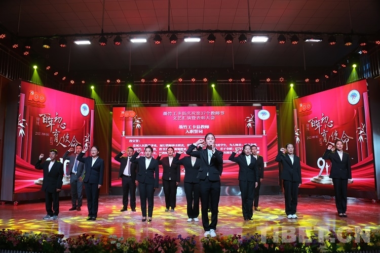 老前輩們的諄諄教誨,激勵著莘莘學子健康成長。他們勤勤懇懇做事、踏踏實實做人的優(yōu)良作風,也讓青年教師頗受觸動。墨竹工卡縣今年新入職的13位教師走上舞臺,舉起右手,面對墨竹工卡縣各族各界代表及師生代表許下他們的鏗鏘誓言。