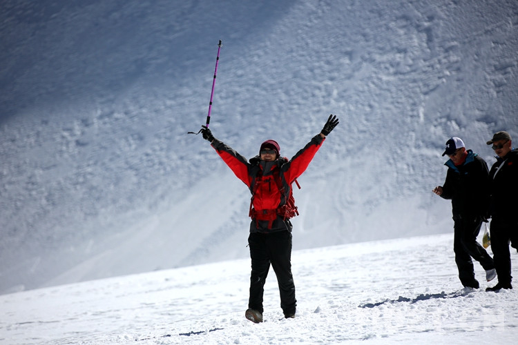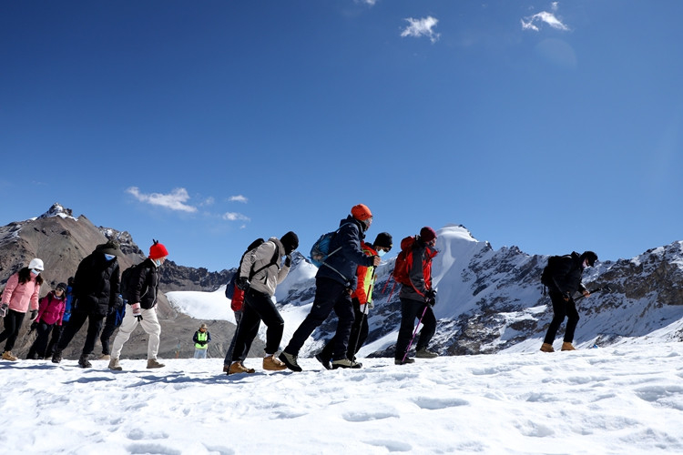 楊女士進(jìn)藏已有半月,在專業(yè)人士的協(xié)助下她第一次近距離接觸了冰雪世界,并攀登到了海拔5600米的地方?!敖裉煳覜]有高原反應(yīng),帶的氧氣也沒用?!痹谘┥缴蠗钆康呐d奮之情溢于言表。