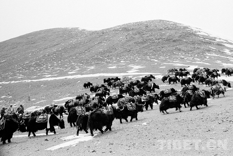 這是馱鹽隊(duì)牧民趕著成群馱牛前往藏北無(wú)人區(qū)的鹽湖去馱鹽(唐召明1988年攝)