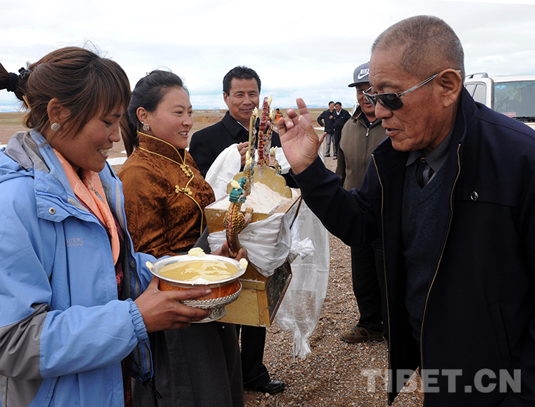 這是那曲地區(qū)雙湖特別區(qū)(現(xiàn)那曲市雙湖縣)的青年在向來(lái)訪(fǎng)的老領(lǐng)導(dǎo)洛桑丹珍敬青稞酒(唐召明2013年7月25日攝)