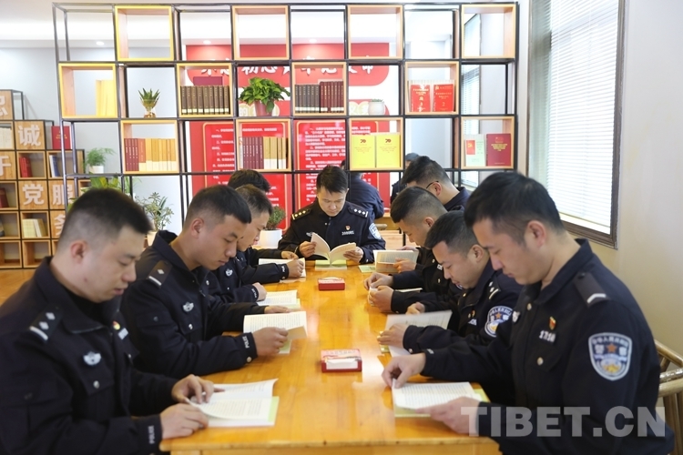 圖為林芝邊境管理支隊(duì)機(jī)關(guān)民警閱讀紅色書(shū)籍 攝影:柳春偉