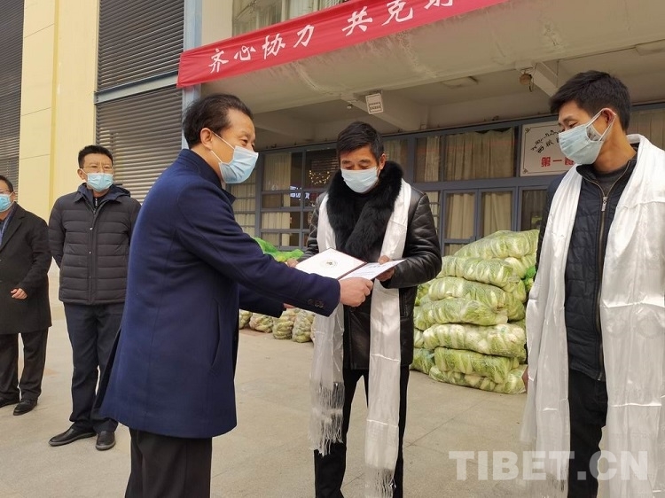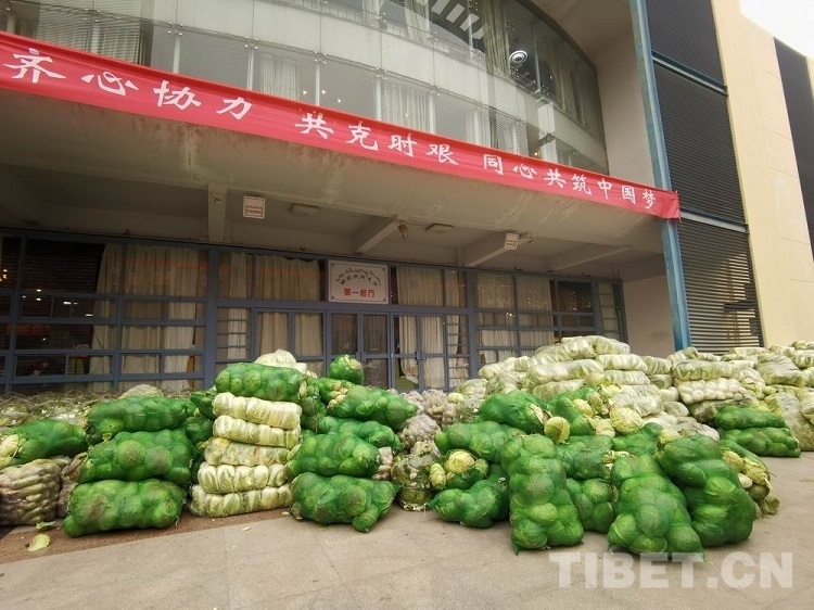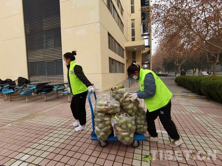 圖為西藏民族大學(xué)志愿者搬運(yùn)受贈(zèng)蔬菜