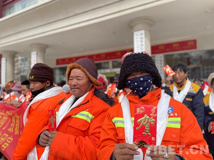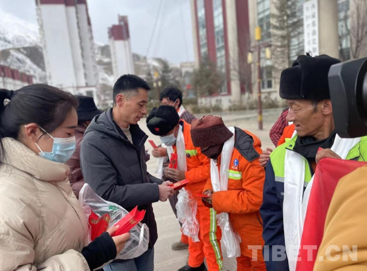 中國(guó)西藏網(wǎng)訊 2月28日,在藏歷新年到來(lái)之際,西藏自治區(qū)那曲市比如縣政府大樓前正在開展一場(chǎng)溫暖人心的慰問活動(dòng)?!靶履旰?,給大家拜年了,衷心祝愿大家在新的一年里身體健康、工作順利?!?慰問現(xiàn)場(chǎng),川英集團(tuán)負(fù)責(zé)人向每位環(huán)衛(wèi)工人和城管協(xié)管員獻(xiàn)上潔白的哈達(dá)致以新年的美好祝福,感謝他們?yōu)楸热绛h(huán)衛(wèi)事業(yè)作出的貢獻(xiàn),并送上1000元慰問金。(中國(guó)西藏網(wǎng) 記者/賈華加 比如縣宣傳部供圖)