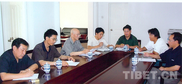 圖為陳慶英先生(左3)主持中國藏學(xué)研究中心歷史研究所會議,討論《西藏通史》相關(guān)工作 (圖片由張?jiān)铺峁?/p>