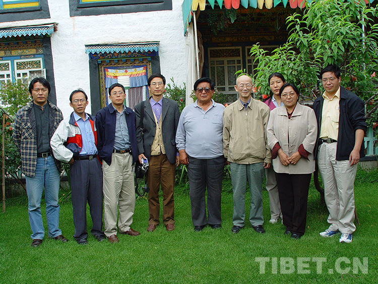 圖為陳慶英先生(右4)帶領(lǐng)課題組成員在西藏調(diào)研期間與西藏社會科學(xué)院、西藏大學(xué)專家合影 (圖片由張?jiān)铺峁?/p>