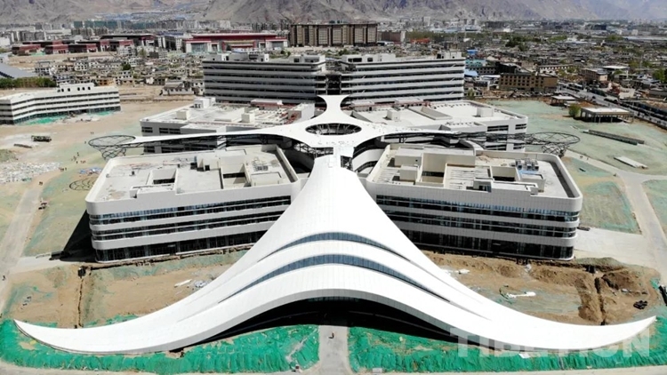 中國西藏網(wǎng)訊 挖掘機的轟鳴聲、鋼管的碰撞聲,走進西藏自治區(qū)醫(yī)院項目施工現(xiàn)場,一派忙碌的景象。從空中俯瞰,建設中的西藏自治區(qū)醫(yī)院外形宛如一朵格桑花,目前正進行室內(nèi)裝修和機電安裝。