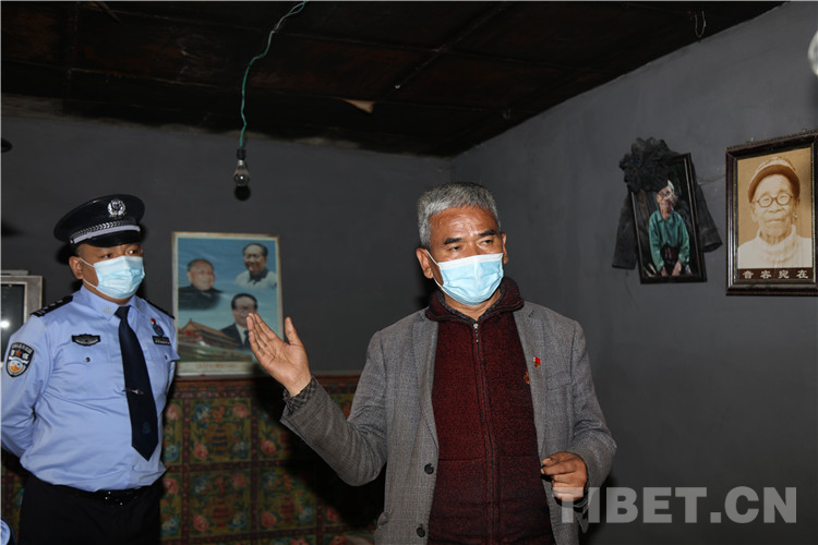 圖為邦村村長羅布在老阿媽故居向邊檢站民警講述國旗老阿媽事跡 攝影:尼瑪旦增