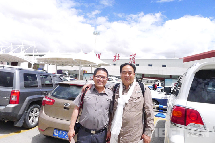 圖為時任中央人民廣播電臺、中國國際廣播電臺西藏記者站站長、現(xiàn)任中央廣播電視總臺西藏總站站長曾曉東到拉薩機場迎接。攝影 張?zhí)一?/p>