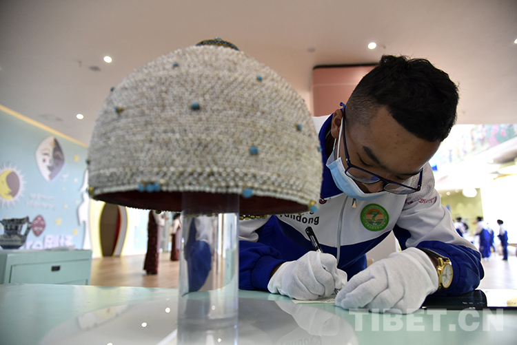 “我從電視上看了‘三星堆’發(fā)掘直播節(jié)目,對歷史產生了濃厚的興趣。后來,自己也閱讀了西藏歷史相關書籍,覺得非常吸引人。今天,我們來到了煥然一新的西藏博物館,通過參觀展覽對歷史也有了更生動的感受?!崩_市第七中學八年級四班歷史課代表旦增羅布正在認真記錄自己戴上手套觸摸文物仿制品的感受。