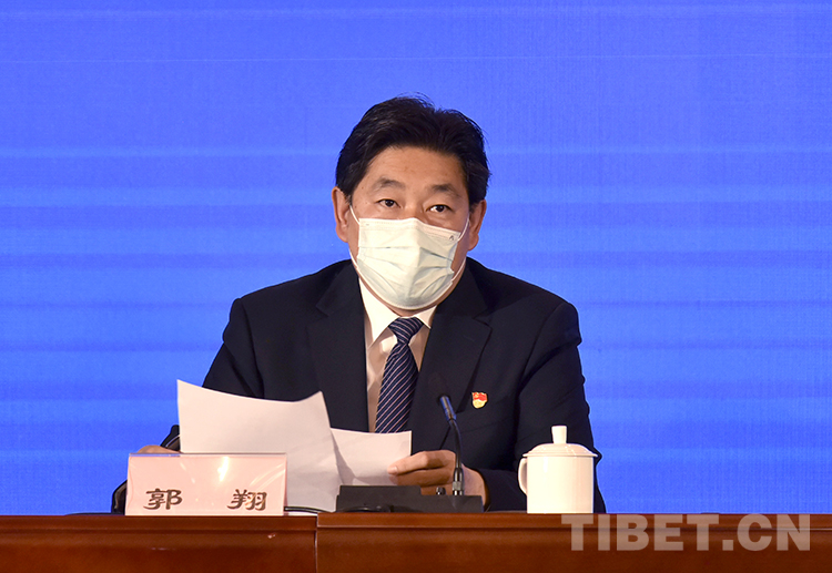圖為西藏自治區(qū)新型冠狀病毒肺炎疫情防控工作第四場新聞發(fā)布會上,西藏自治區(qū)經(jīng)濟和信息化廳黨組成員、副廳長、一級巡視員郭翔介紹疫情期間防疫物資保障情況 攝影:王媛媛
