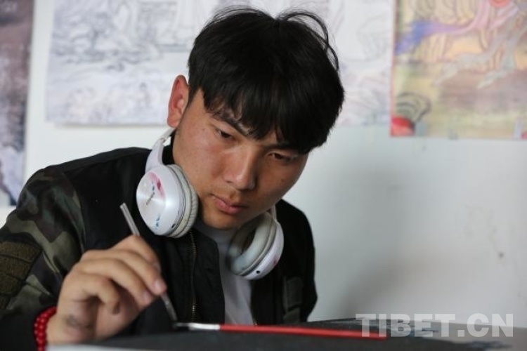 同期學(xué)員中,同樣來自唐卡世家的白瑪旺青,肩負家族厚望,被父親委派而來。2019年,白瑪旺青的父親學(xué)到半途,家中突然接到《格薩爾王與三十大將》的唐卡長卷訂單,不得不退學(xué)回到江達縣家中主持繪制工程。這次,他把兒子白瑪旺青、學(xué)徒桑培和尼瑪布派來學(xué)習(xí),自己帶著46個學(xué)徒繼續(xù)完成訂制唐卡的繪制?!案赣H對唐卡漆畫很支持,要求我們認真學(xué),學(xué)成后再傳授給他本人和更多的學(xué)徒,”白瑪旺青說,“我和父親覺得,創(chuàng)作漆畫比傳統(tǒng)唐卡快,也會贏得新的市場,能帶動更多學(xué)徒增收?!?/p>