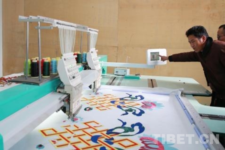 洛隆縣博織利民服飾有限公司老總向巴操作電子刺繡機刺繡帳篷上的圖案。陳衛(wèi)國攝