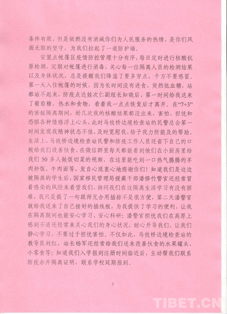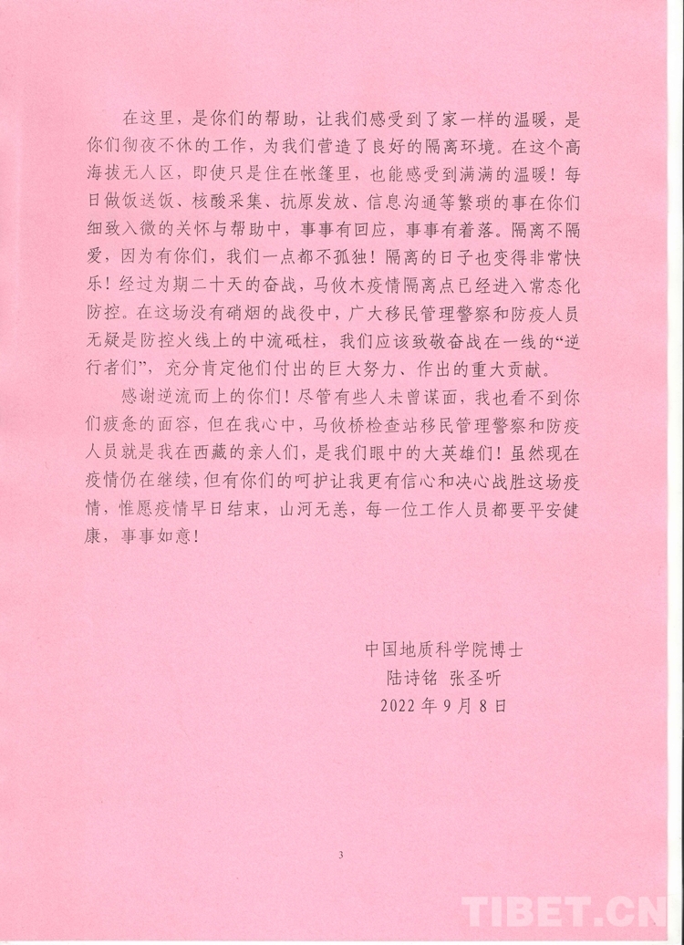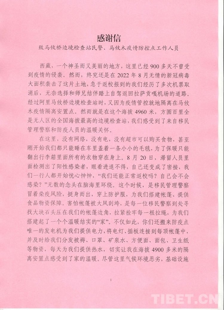 中國西藏網(wǎng)訊 “感謝逆流而上的你們!盡管有些人未曾謀面,我也看不到你們疲憊的面容,但在我心中,馬攸橋邊境檢查站移民管理警察,就是我在西藏的親人們,是我們眼中的大英雄們!”這段感人肺腑的言語來自西藏出入境邊防檢查總站阿里邊境管理支隊(duì)馬攸橋邊境檢查站臨時(shí)安置點(diǎn)馬攸木2名博士的一封感謝信。