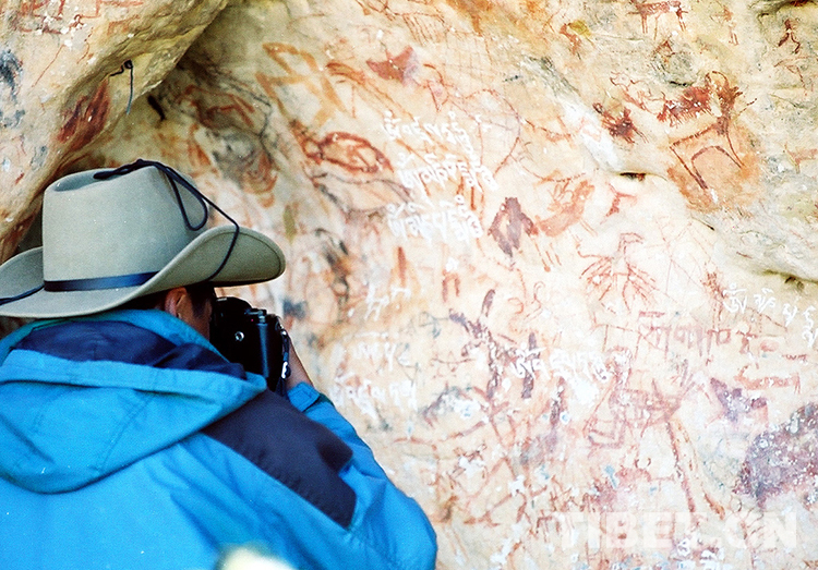 這是科考人員在對(duì)一處洞穴巖畫(huà)進(jìn)行考察(唐召明2001年攝)