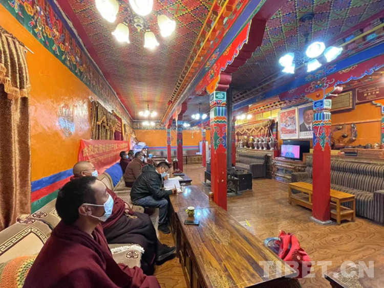 圖為10月16日上午,西藏自治區(qū)日喀則市定結(jié)縣曲果德慶林寺僧眾、駐寺干部在一起收看黨的二十大開幕會(huì)直播