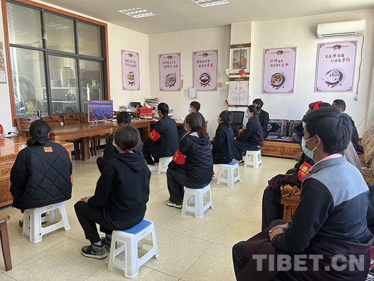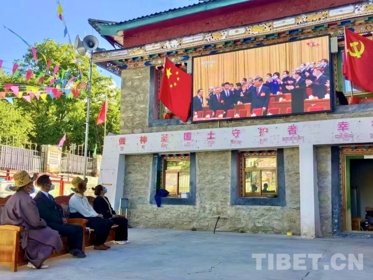 圖為西藏自治區(qū)林芝市朗縣朗鎮(zhèn)托麥村村干部通過(guò)電視大屏收聽收看黨的二十大開幕會(huì) 圖片由林芝市委宣傳部提供