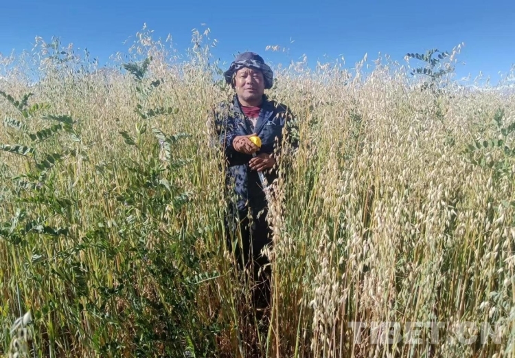 “今年,海拔3990米的林芝市工布江達縣示范點西藏蕃騰農(nóng)牧生態(tài)有限公司基地搶收一年生禾豆混播青干草180噸、夢龍燕麥種子2噸;海拔4500米的阿里地區(qū)噶爾縣示范點阿里草原站基地是貝勒2號和箭筈豌豆混播,搶收青干草畝產(chǎn)突破1噸;海拔4660米的拉薩市當雄縣示范點格達鄉(xiāng)甲朵村基地村集體是青海444燕麥和甜燕麥混播,搶收青干草28噸;海拔3800米的日喀則市桑珠孜區(qū)示范點邏瑪奶牛場搶收青飼玉米24噸;位于拉薩市的海拔3760米的核心試驗點曲尼帕試驗基地種子擴繁點的數(shù)據(jù)正在匯總分析……”談及今年各示范點的數(shù)據(jù),多吉頓珠如數(shù)家珍。