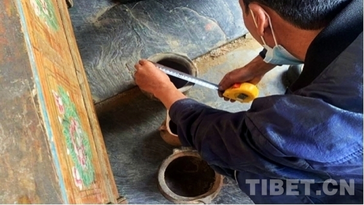 圖為2021年,西藏民族大學(xué)實(shí)習(xí)生參與檢查杰拉康寺木構(gòu)建筑的破損程度,并對(duì)設(shè)計(jì)方案提出意見