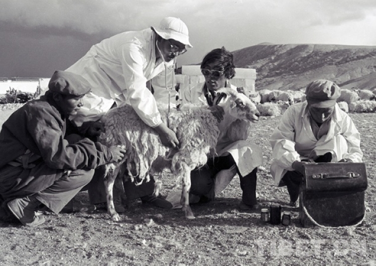 這是文部辦事處(現(xiàn)尼瑪縣)年輕的藏族獸醫(yī)在為羊群診治疾病(唐召明1988年攝)