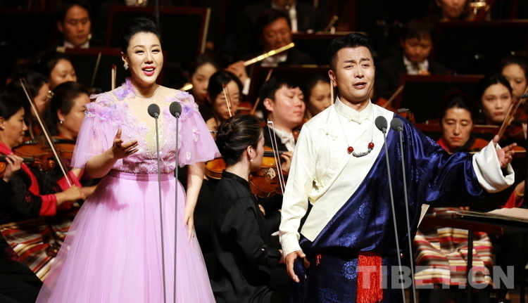 圖為中音歌唱家、國家一級演員霍勇,西藏自治區(qū)歌舞團青年女高音次仁央宗領(lǐng)合唱《美麗的西藏 可愛的家鄉(xiāng)》 攝影:劉莉